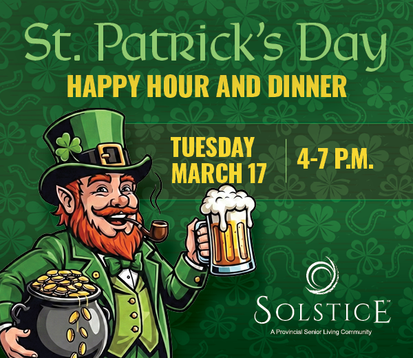 You’re invited to Solstice at Santa Rosa for our St. Patrick’s Day Happy Hour and Dinner. Enjoy good company, cheerful Irish-inspired décor and a festive dinner as we celebrate the luck of the Irish together. RSVP today at SolsticeSeniorLivingSantaRosa.com/signature-event. We look forward to welcoming you!