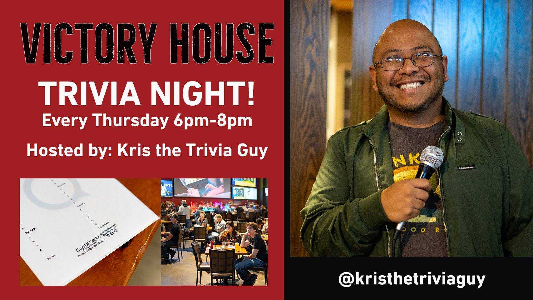Join us for Victory House Trivia every Thursday night as Kris the Trivia Guy entertains and stumps the finest looking room of trivia buffs in the area.
