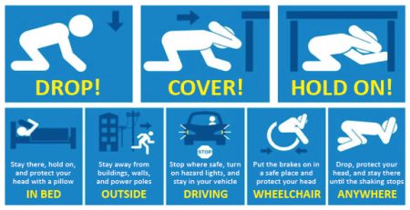 - Practice: Rehearse the “Drop, Cover, Hold On” earthquake drill with family and neighbors. Hold on to any sturdy furniture until the shaking stops.